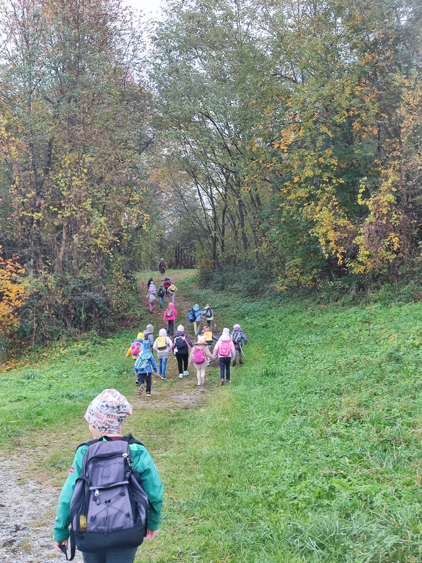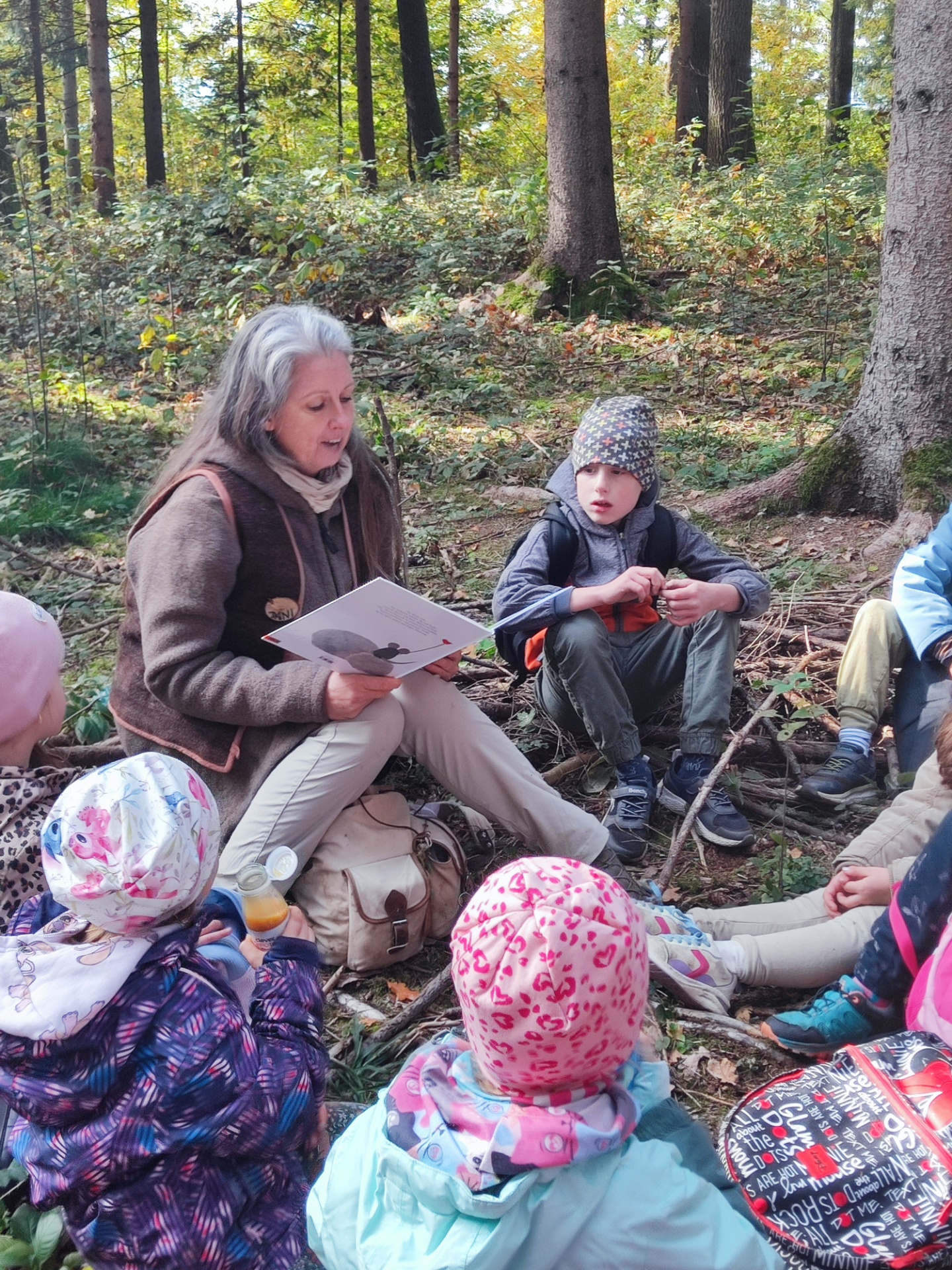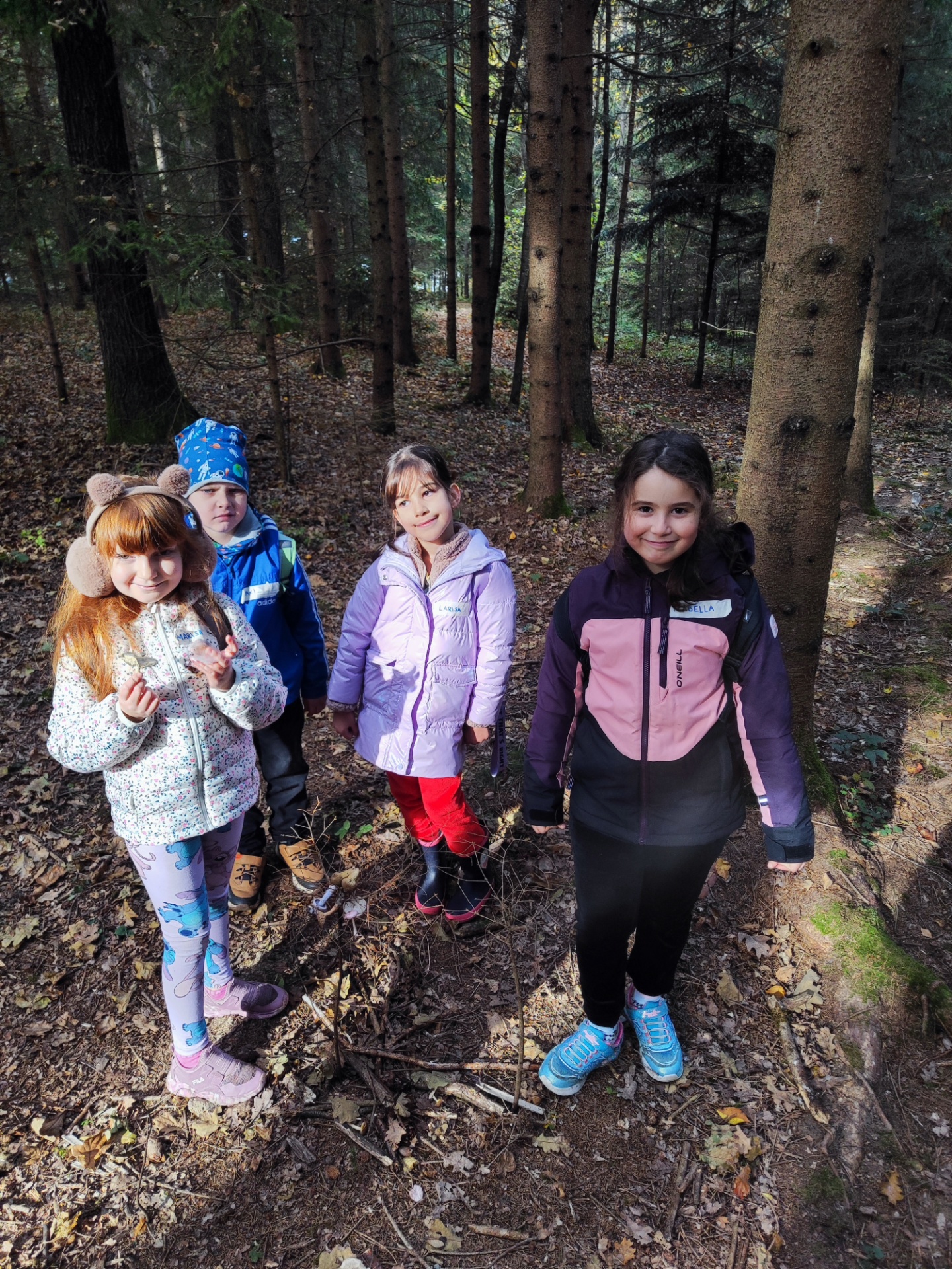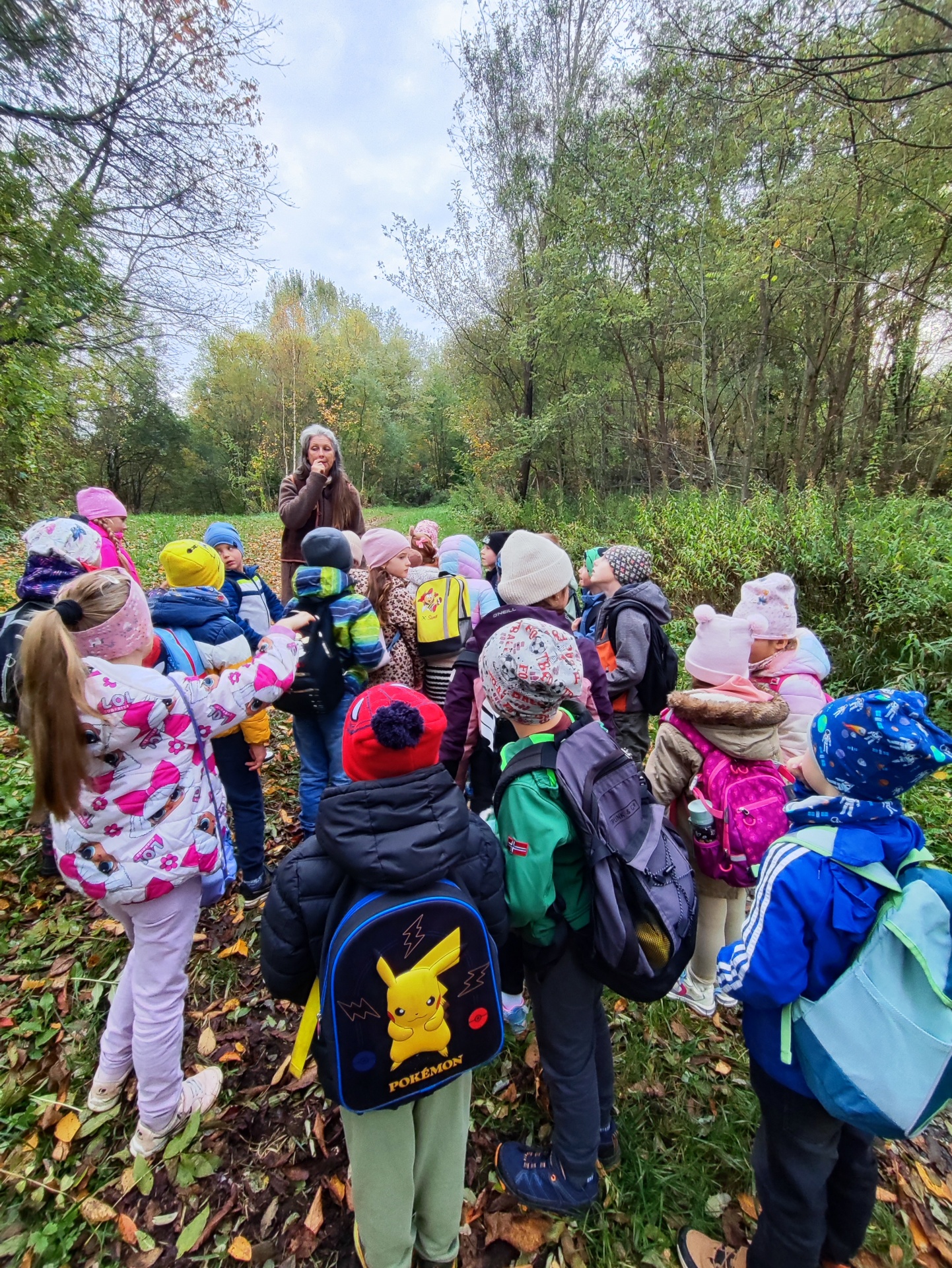 Mit Rucksäcken, Jausen und warmen Jacken ausgestattet, spazierte die Klasse fröhlich in den nahegelegenen Wald.