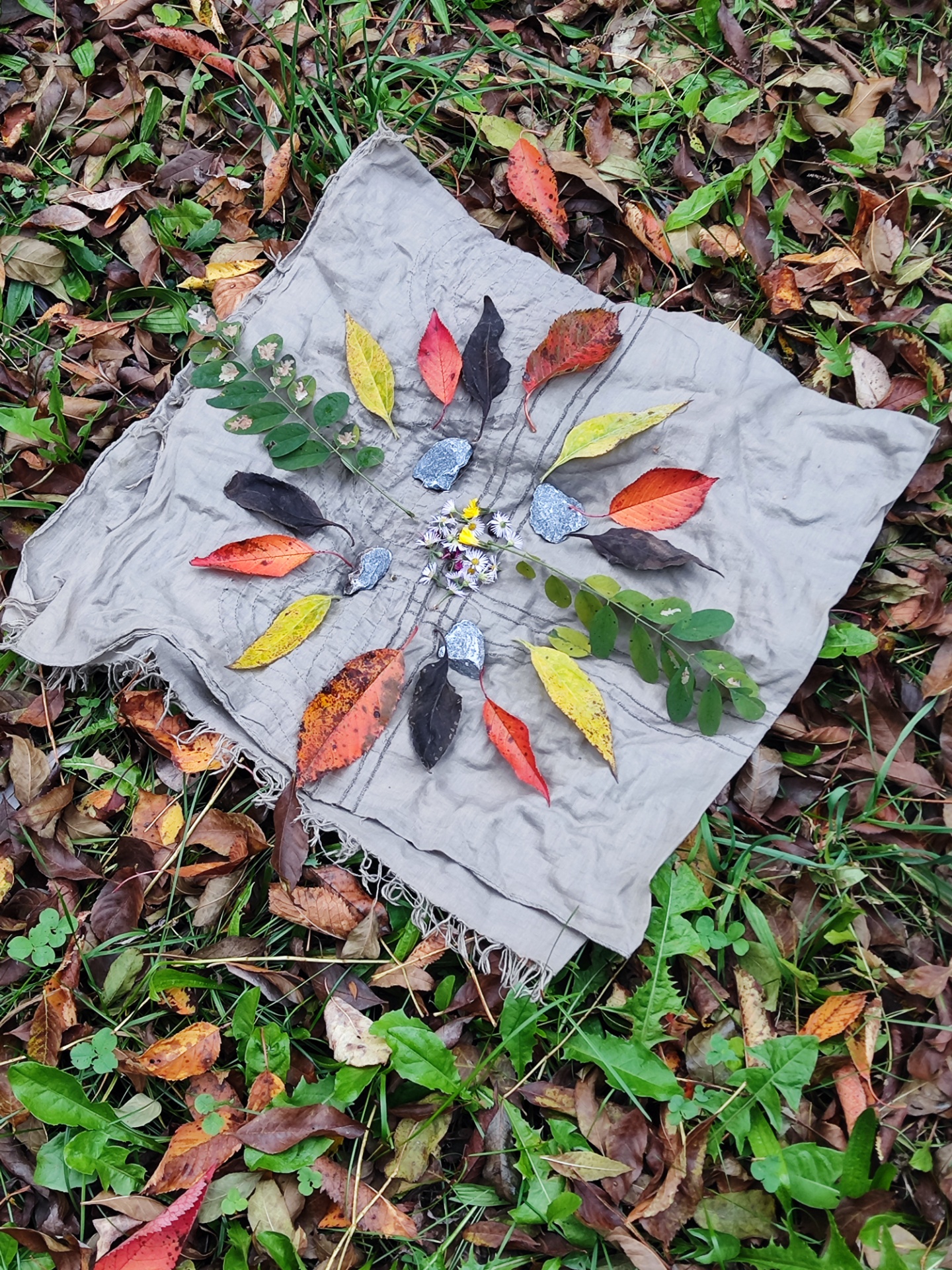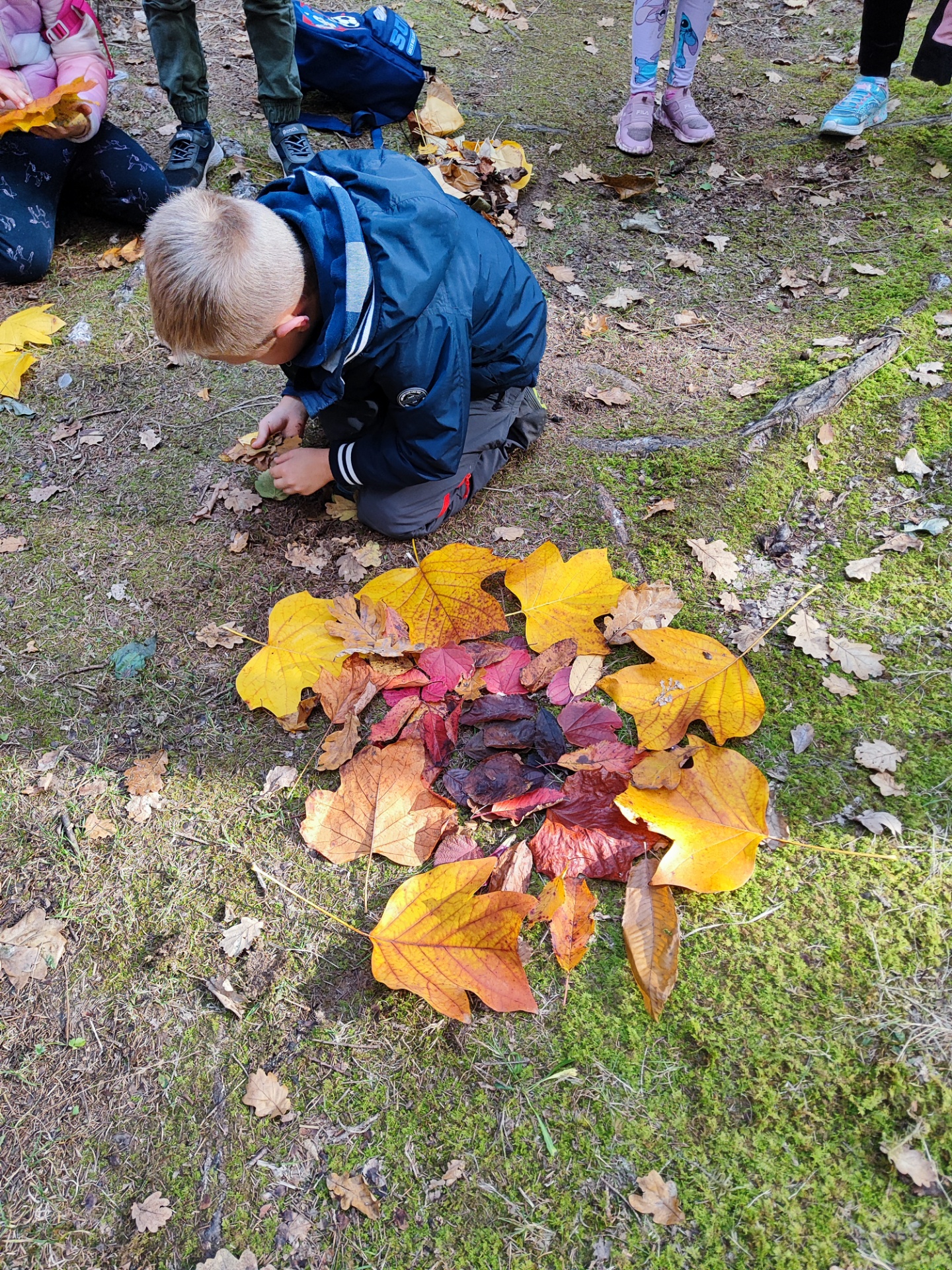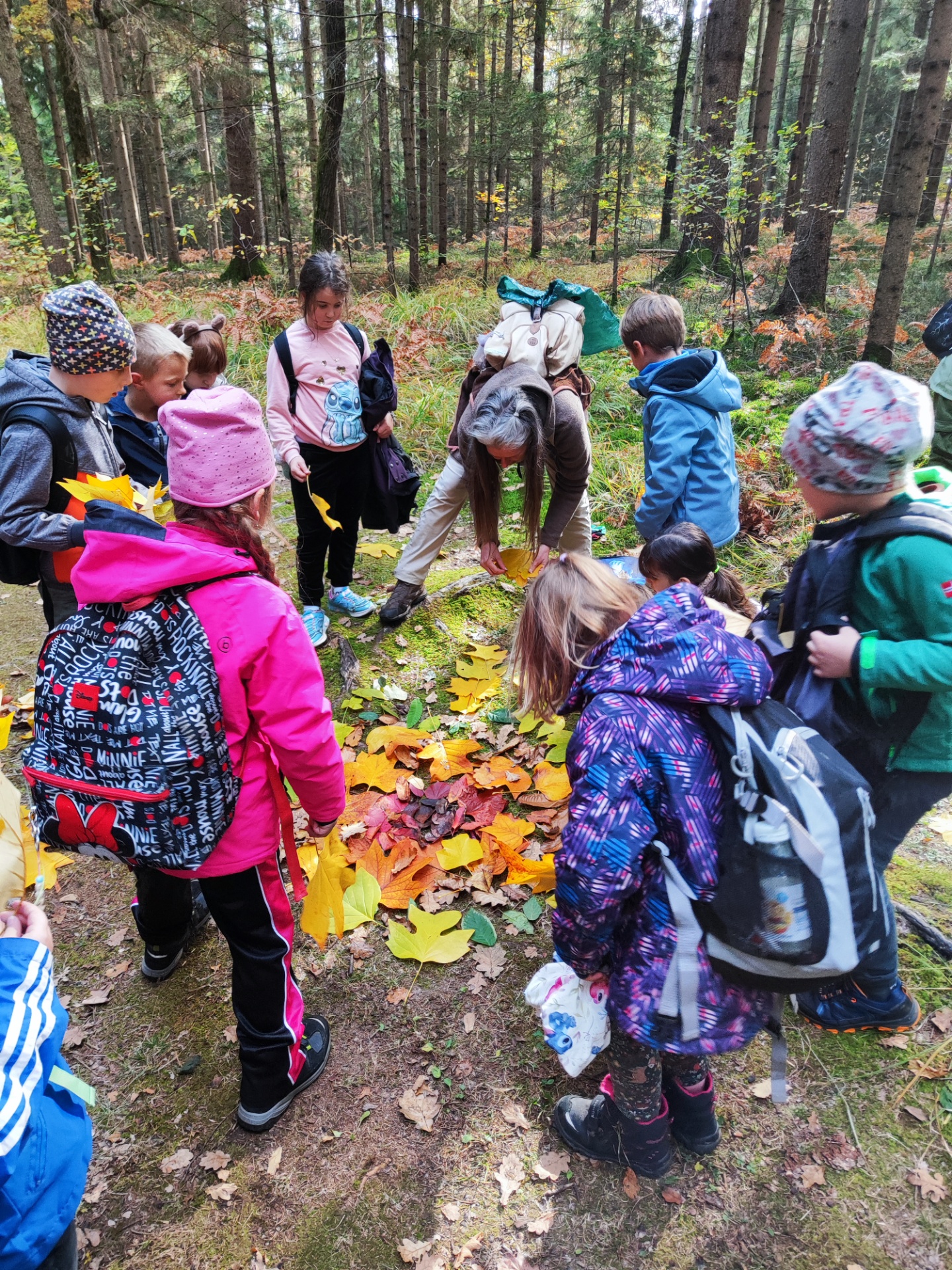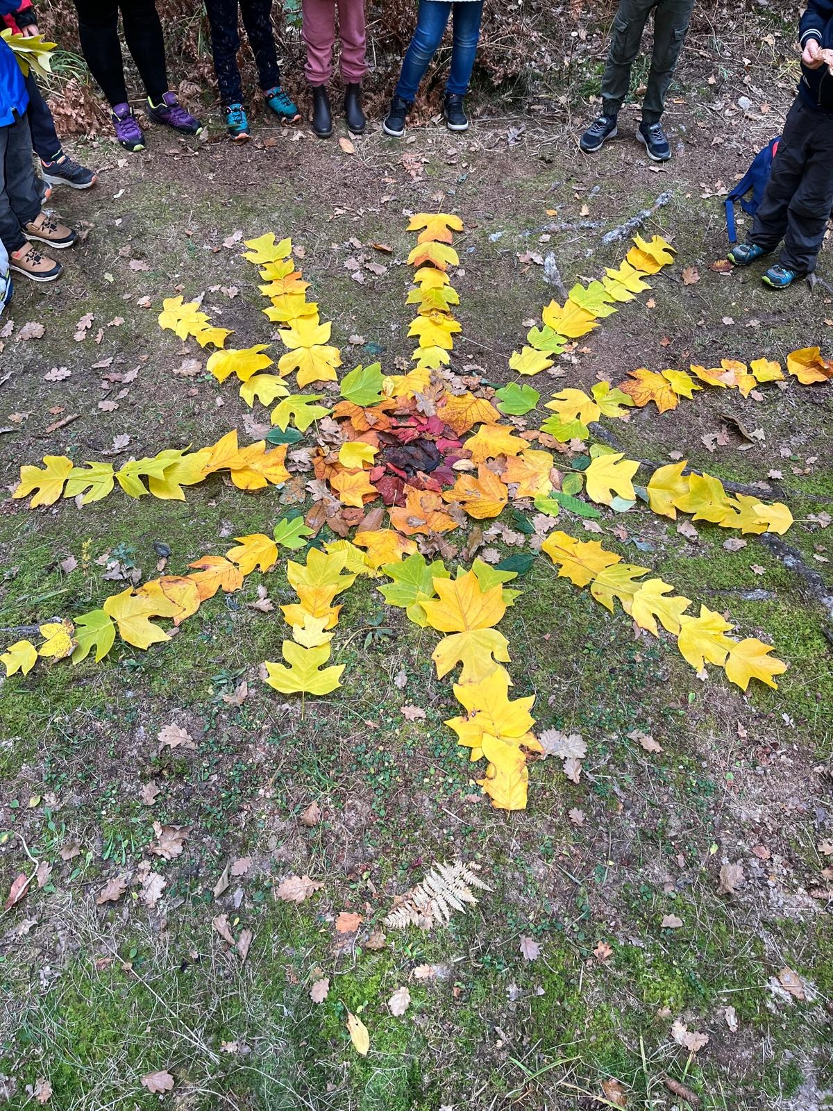 Die Kinder sammelten danach selbst bunte Blätter, die später wie eine warme Herbstsonne, auf dem Waldboden aufgelegt wurden. So entstand ein wunderschönes Farbenspiel mitten im Grünen.