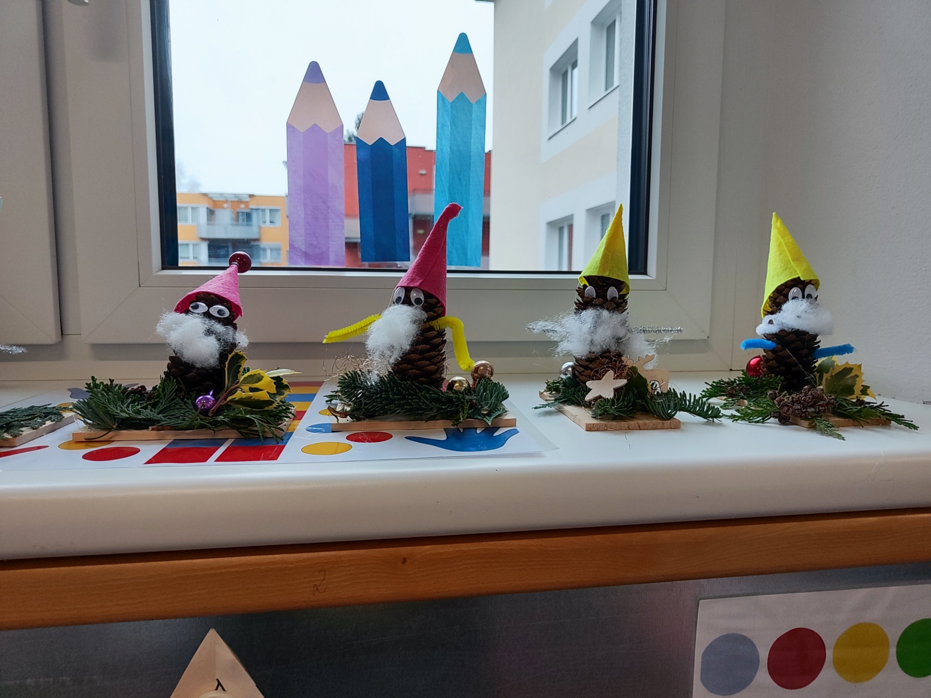 Aus Zäpfen und Zweigen entstanden kleine Wichtelmännchen, die die Kinder mit bunten Mützen und vielen Details individuell verzierten.