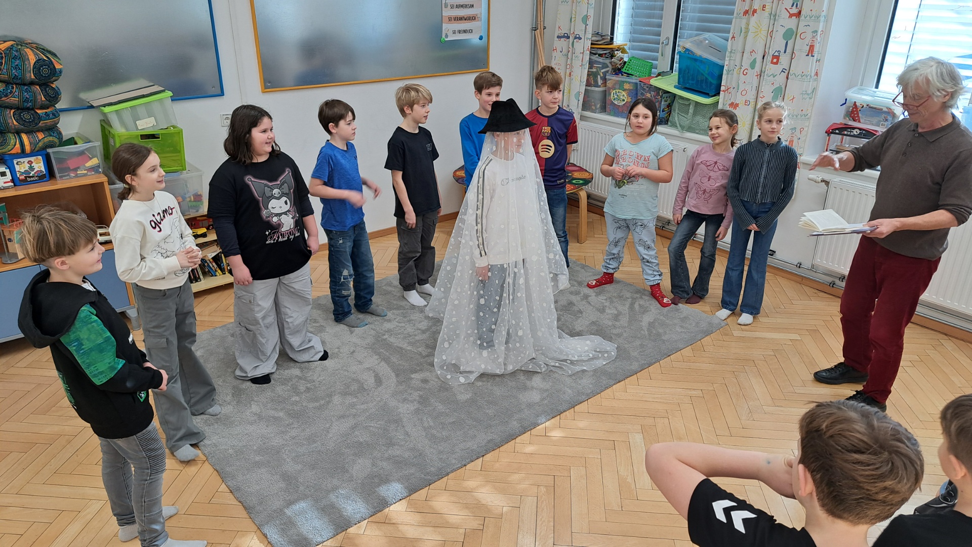 In der Einheit „Jeux dramatiques“ am 14. Jänner 2026 setzten sich die Kinder spielerisch mit einer Szene aus „Die kleine Hexe“ auseinander. Nach einer kurzen inhaltlichen Einführung und dem gemeinsamen Lesen der ausgewählten Textstelle wurden die Figuren, deren Gefühle und die Handlung besprochen und dann nachgespielt. 🎭😄🎭