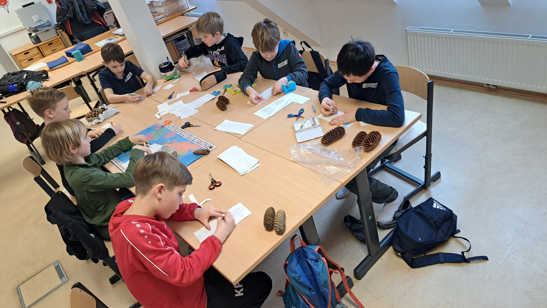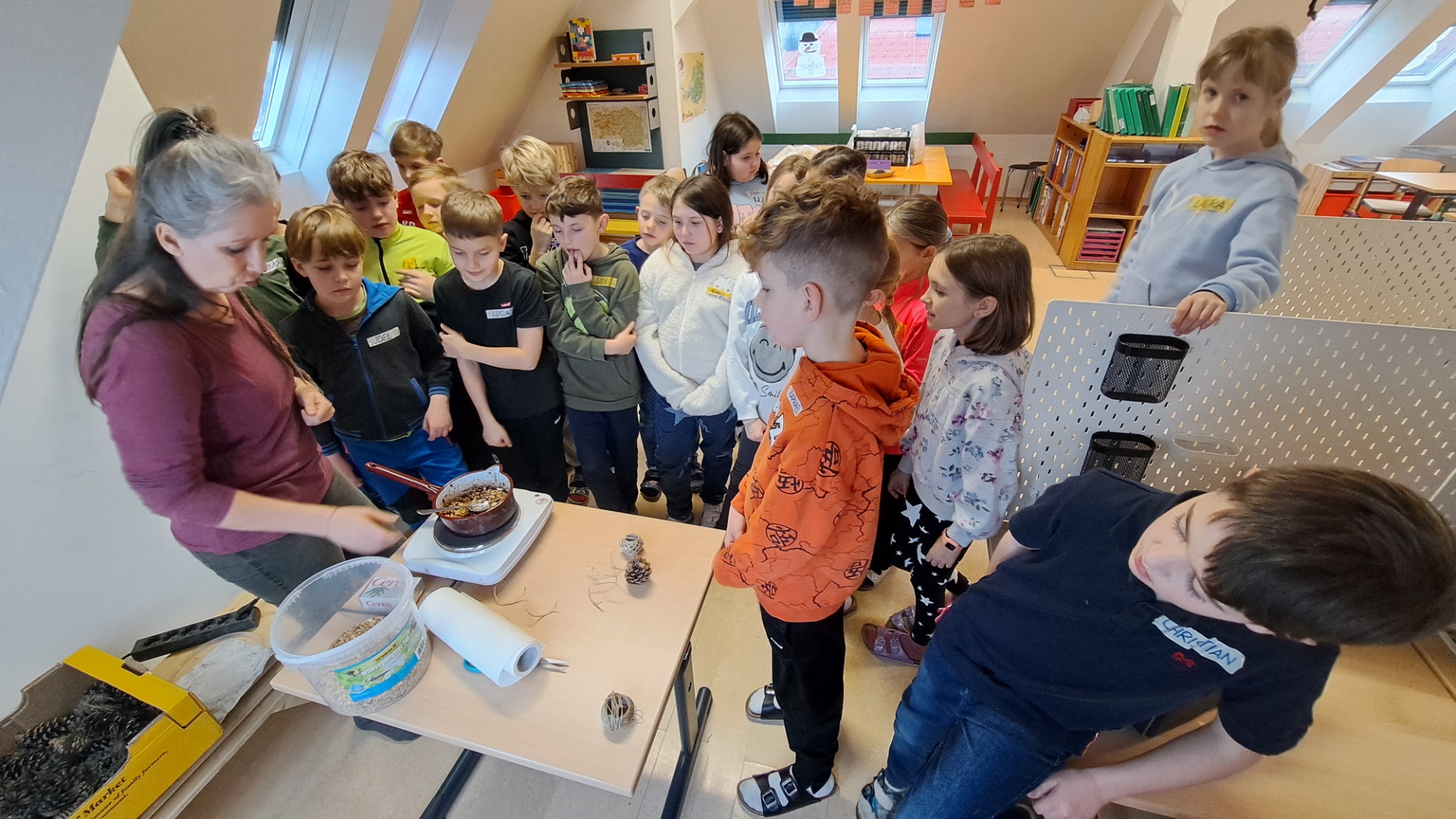 Anschließend arbeiteten die SchülerInnen an verschiedenen Stationen: Mit großer Begeisterung stellten sie Futterzapfen für Vögel her. Außerdem mischten sie eine Teemischung aus getrockneten Kräutern und gestalteten dafür kleine Säckchen zur Aufbewahrung.